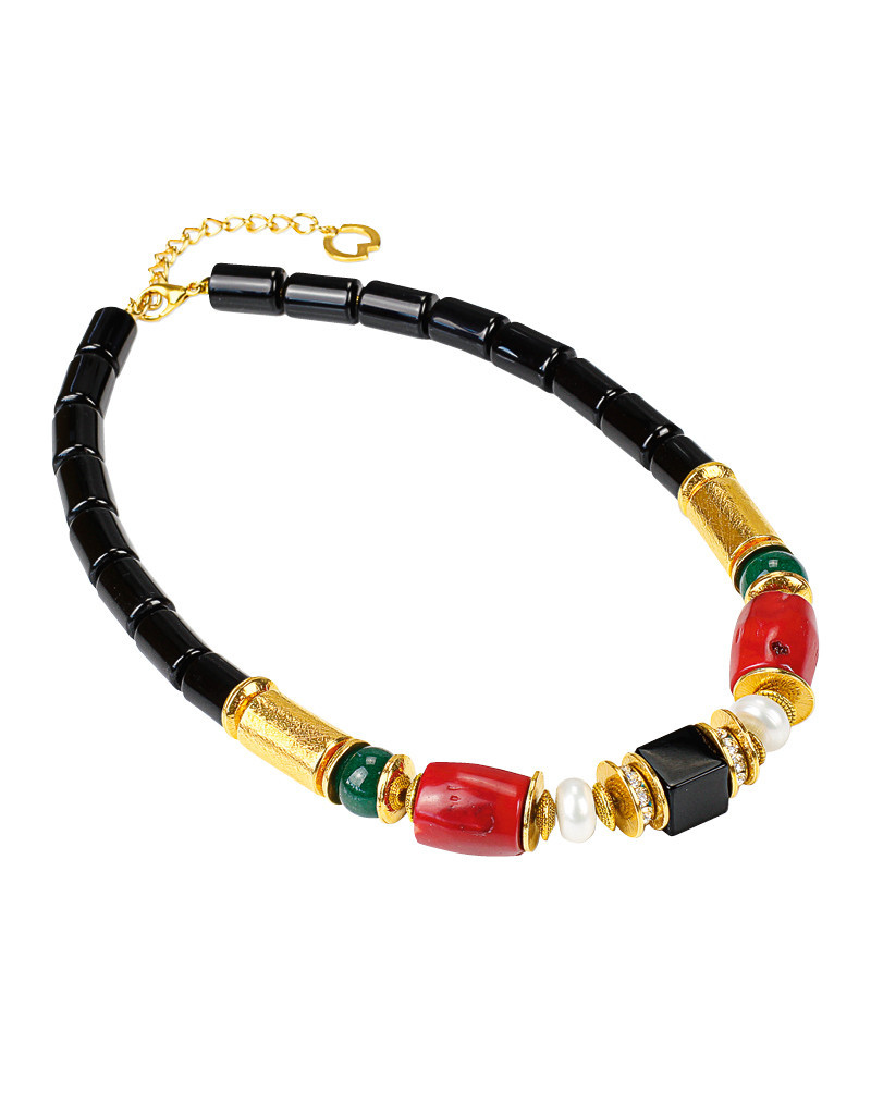 Die Schmuckdesignerin Petra Waszak hat exklusiv für ars mundi dieses vom Jugendstil inspirierte Schmuckstück entworfen. Edler Onyx kombiniert mit Koralle, grünem Achat, echten Zuchtperlen, Kristallen und mit Feingold plattierten und gebürsteten Messingelementen.